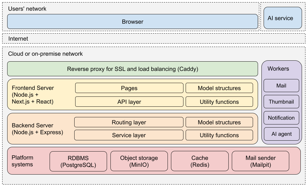バックエンドのサービスと分離したワーカープロセスがいくつかある。それらは、バックエンドのリクエストの中で実行するには時間がかかりすぎる処理を担当する。各ワーカーはRedisにキューイングされたタスクを逐次実行していく。メールの送信、サムネイルの作成、ユーザへの通知の作成、そしてAIエージェントの駆動がそれにあたる。