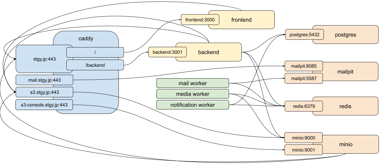 DBサーバにはPostgreSQLを採用した。MySQLでも別に良かったのだが、管理系のコマンドが使いやすいのでPostgreSQLにした。キャッシュにはRedis、ファイルストレージにはMinIO、メールサーバにはMailpit、リバースプロクシにはCaddyを使うことにした。いずれのサブシステムもAWS上でマネージドシステムが利用できる。PostgreSQLにはRDSが、RedisにはElastic Cacheが、MinIOにはS3が、MailpitにはSESが、CaddyにはALBが対応する。